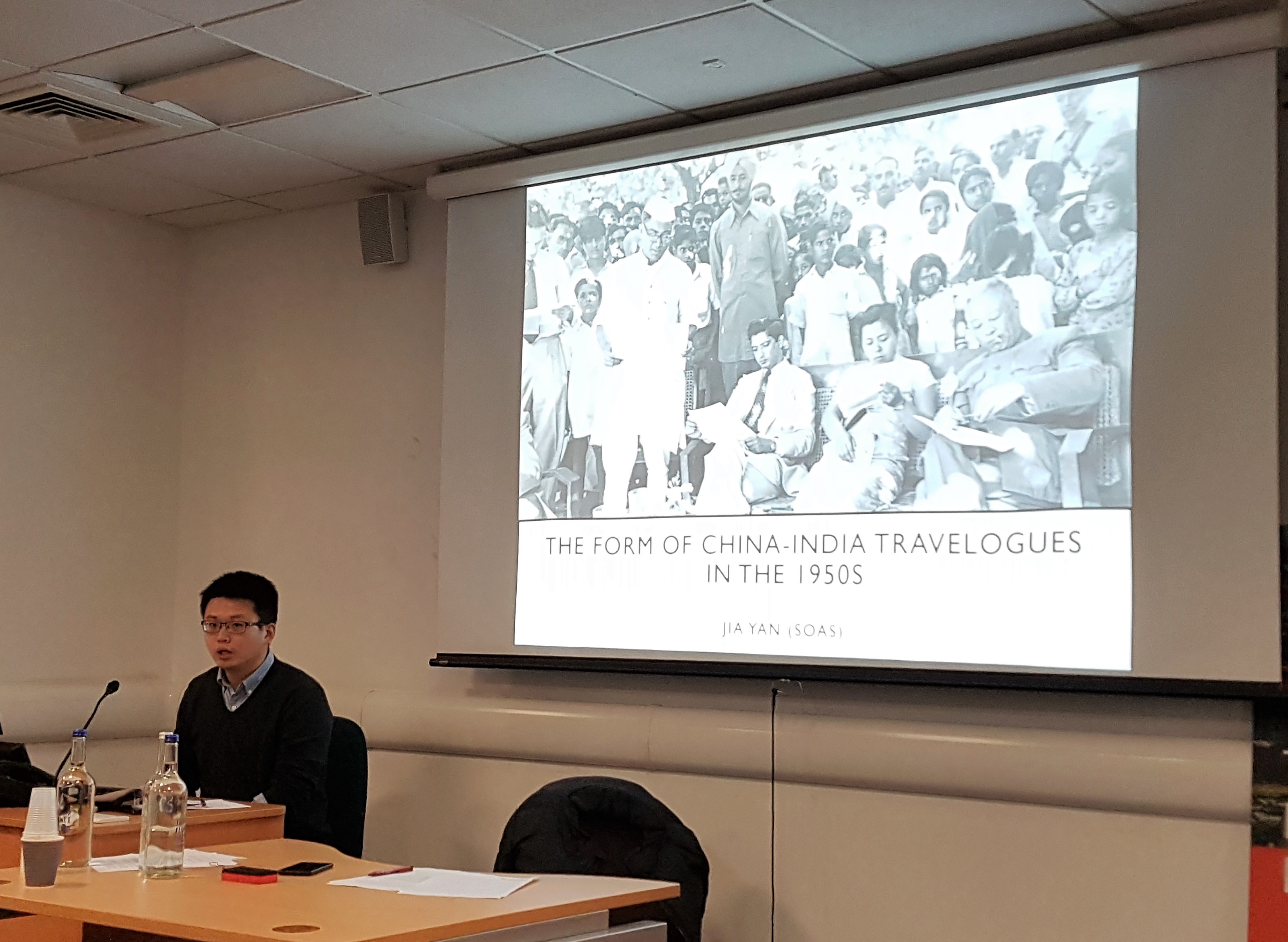 Jia Yan considered the travelogue as a form of ideological expression in his presentation, “The form of China-India Travelogues in the 1950s.” He focused on the ambivalent political relations between India and China from 1950-1962 and the use of cultural diplomacy. Striking differences emerge from the accounts of the writers who took part in cultural delegation exchanges. Chinese travelogues were government-funded and largely conformed to a politics of enhancing friendship; writers were briefed that they should not comment on current politics so as not to embarrass their ally, PM Jawaharlal Nehru. As a consequence there is a marked absence of contemporary socio-political life in the Chinese travelogues. On the Indian side, travelogues (part of an expansive multilingual archive) paid more attention to contemporary life, including the political revolution, which Yan read as providing an opportunity for comparison with India’s unsatisfactory status quo. Divergent conclusions, moreover, point to limited government influence on Indian writers and their cultural production. He concluded that, in the case of Indian travelogues, China often served as a point of reference that confirmed a predetermined ideological stance – whether pro- or anti-communist.